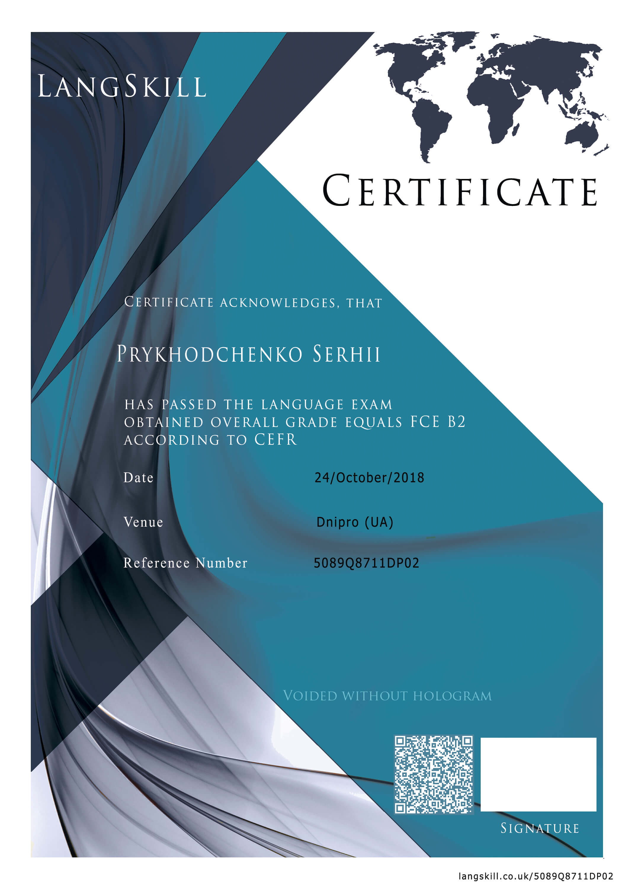 1. Кандидат технічних наук, спеціальність 05.13.07 - Автоматизація процесів керування, диплом ДК № 053688 від 15.10.2019 р. 2. Педагогічна майстерність викладача вищої школи, Бердянський державний педагогічний університет, свідоцтво №AD040/2020 від 30.11.2020 (1 кредит). 3. IT Ukraine Association Teacher’s Internship program, EPAM Systems, Kyiv, свідоцтво №360 від 28.08.2020 (108 годин). Закордонні стажування: